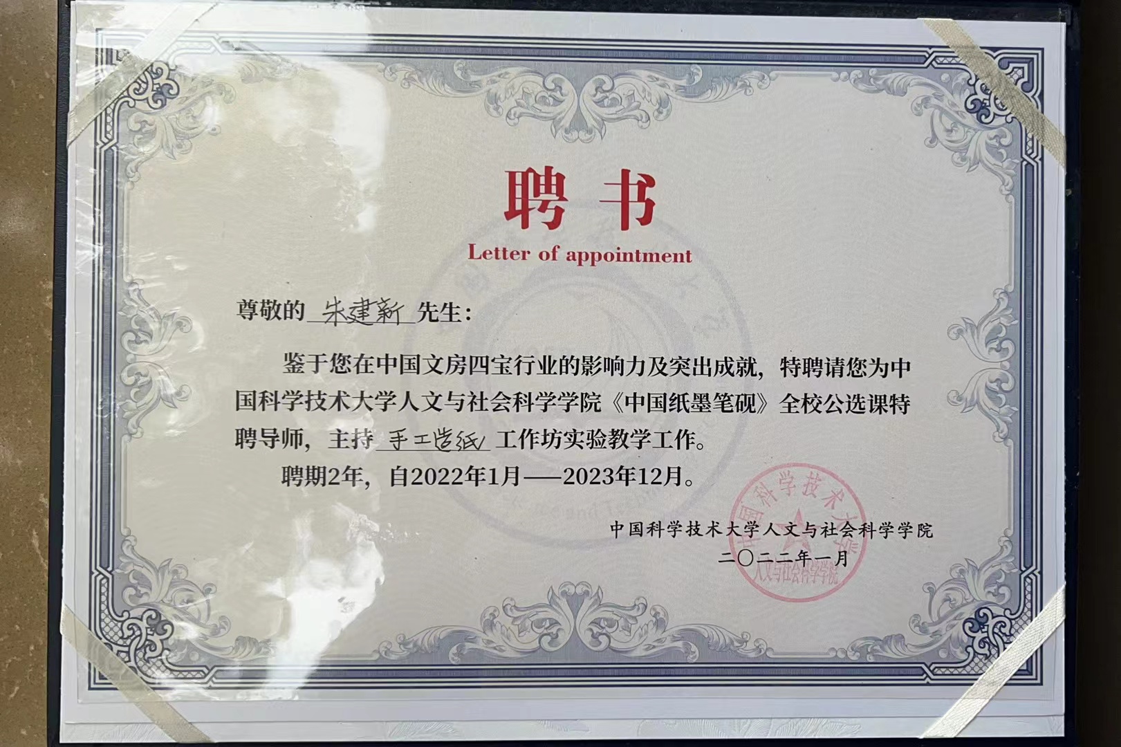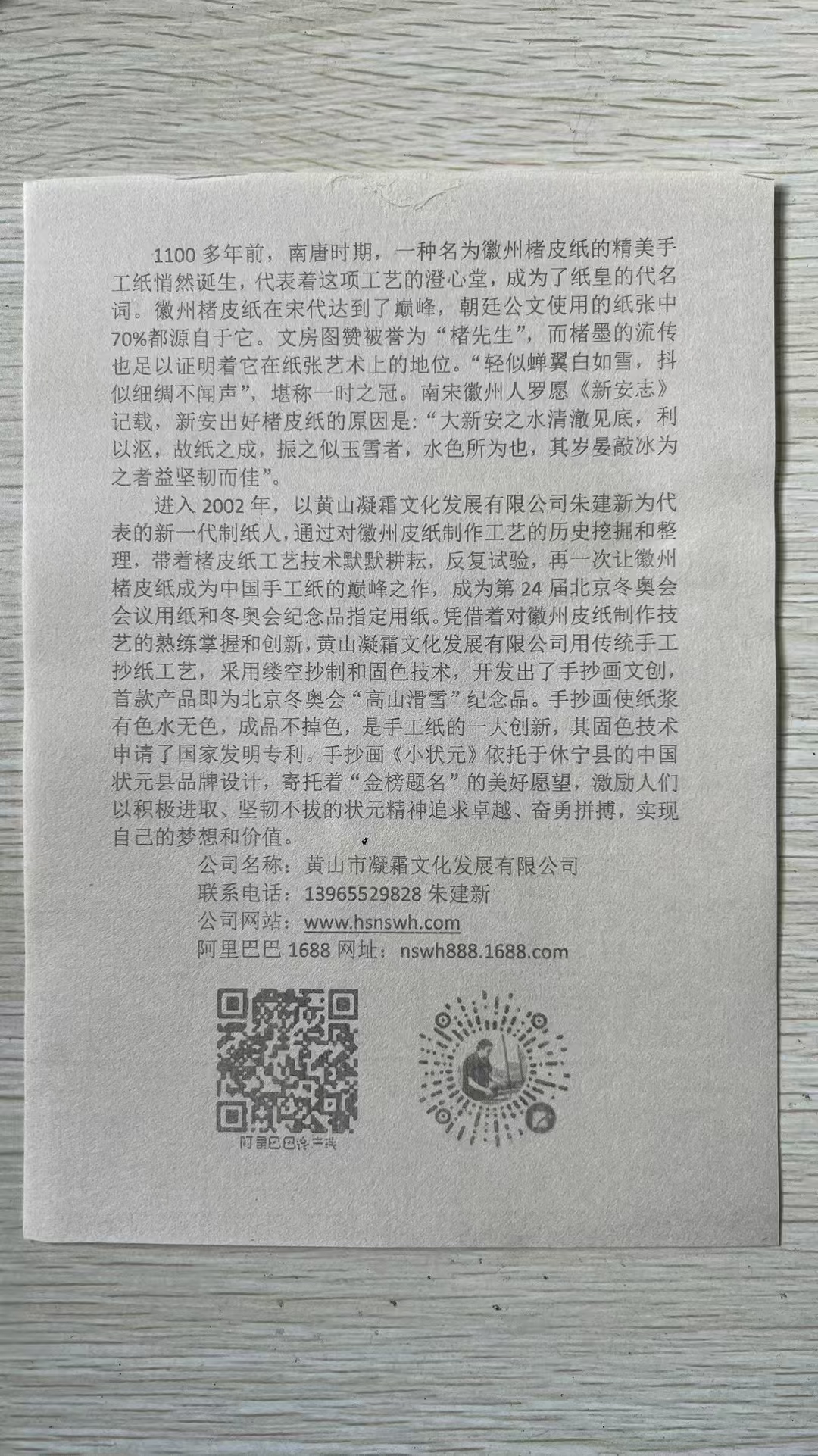2020年公司實(shí)現(xiàn)了文化類規(guī)上企業(yè),迄今已申請(qǐng)了15項(xiàng)發(fā)明專利,19項(xiàng)實(shí)用新型專利,其中已授權(quán)發(fā)明專利3項(xiàng),實(shí)用新型專利11項(xiàng);2022年,公司為北京第24屆冬季奧運(yùn)會(huì)提供楮皮紙和紀(jì)念品,非遺傳承人朱建新被授予北京2022年冬季奧會(huì)參與證書,以感謝第24屆冬奧會(huì)取得圓滿成功做出的貢獻(xiàn)。2022年-2024年,朱建新被中國(guó)科技大學(xué)聘為《中國(guó)筆墨紙硯》全校公選課特聘導(dǎo)師;2023年,朱建新獲省級(jí)非遺傳承人稱號(hào)、“黃山工匠”稱號(hào)。