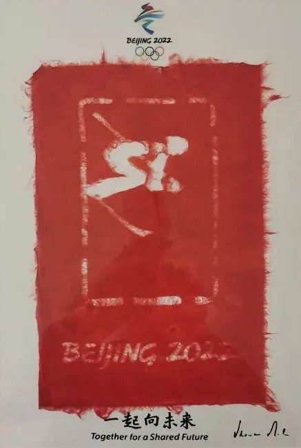 下圖便是使用徽州楮皮紙制作的北京冬奧會紙藝作品紀(jì)念品。一張厚實(shí)的白色襯紙上張貼著特別裁剪過的紅色襯紙,映出栩栩如生的高山滑雪樣式和“BEIJING 2022”字樣,十分高雅。