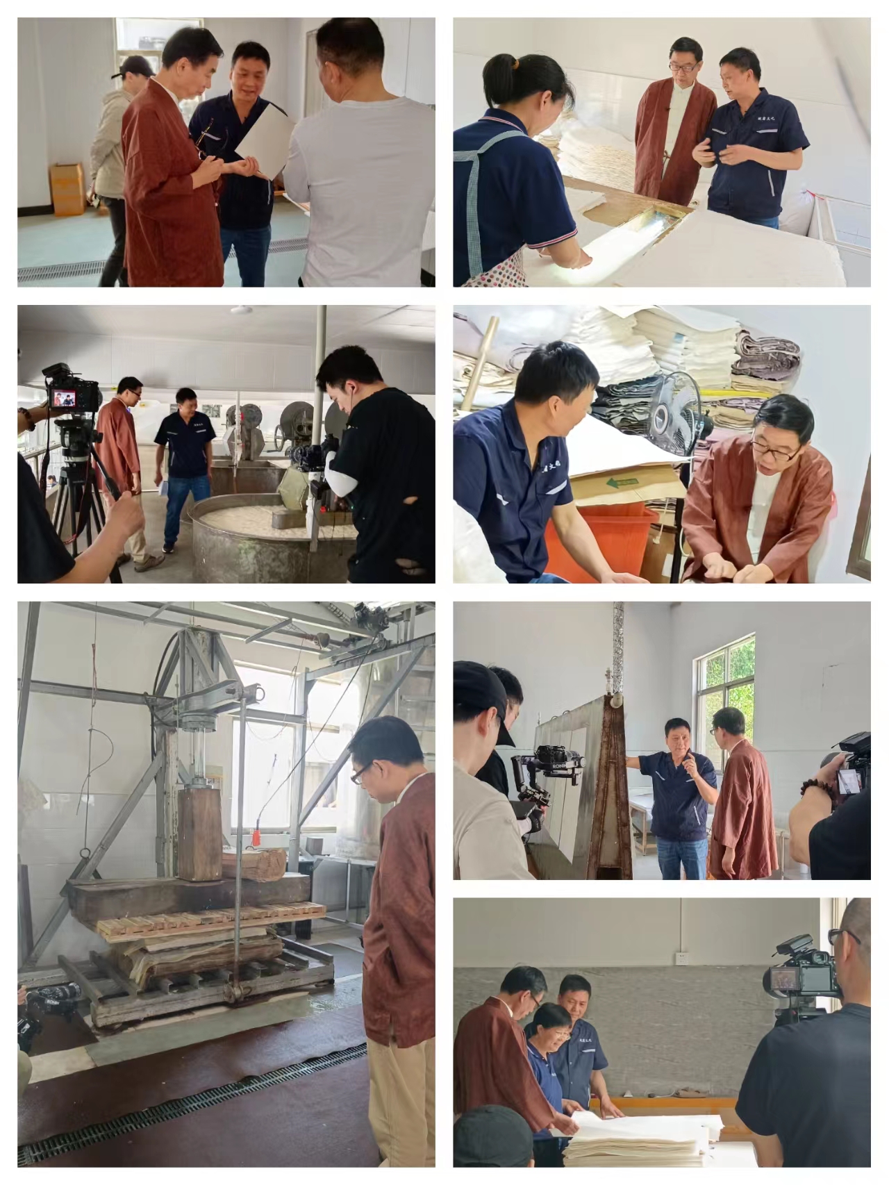 在黃山市凝霜文化發(fā)展有限公司,欄目攝制組全程記錄徽州楮皮紙第二代傳承人、非遺傳承人朱建新的徽州楮皮紙制作技藝?!段幕笥^園》總策劃、主持人王魯湘詳細(xì)了解徽州楮皮紙的優(yōu)勢,制作的傳承和發(fā)展,并與徽州楮皮紙第二代傳承人朱建新面對面暢聊古法造紙和新技的結(jié)合。